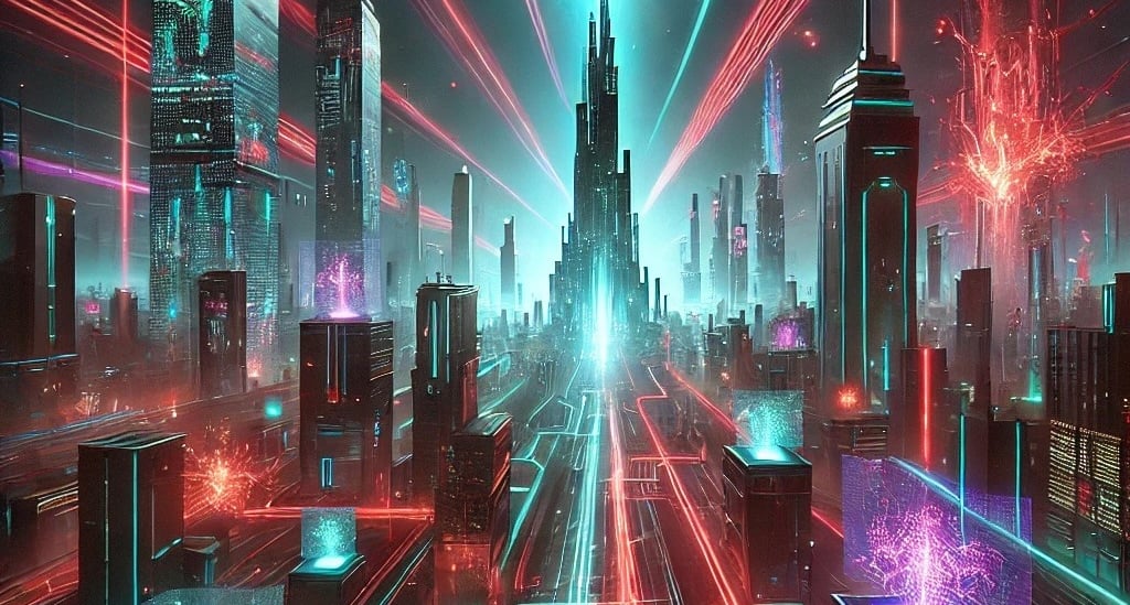 The skyline of Basepoint dimmed as Skylink Tower, the central data hub, faltered. Screens flickered, transaction verifications hung in loops, and holographic advertisements were sent into jagged bursts of light.